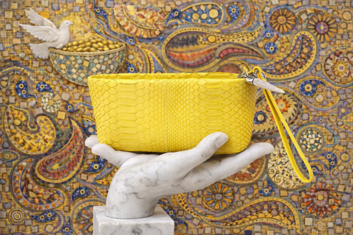 Materials: Genuine yellow python skin. Wristlet: python. Mini horn is biodegradable calcium.Interior: genuine suede, genuine python interior pocket.