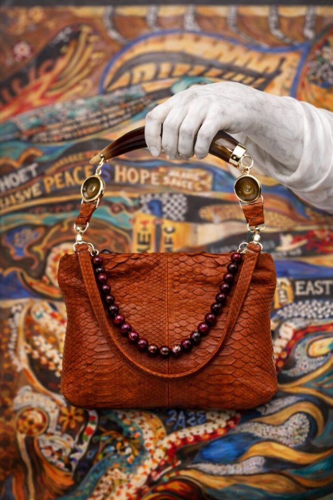 Materials: Stainless steel hardware on handbag. German silver on horn handle; Horn is biodegradable calcium component. Outer Genuine Python, custom printed leather, with genuine suede interior with an interior python pocket. Removable python strap handle and removable horn handle.